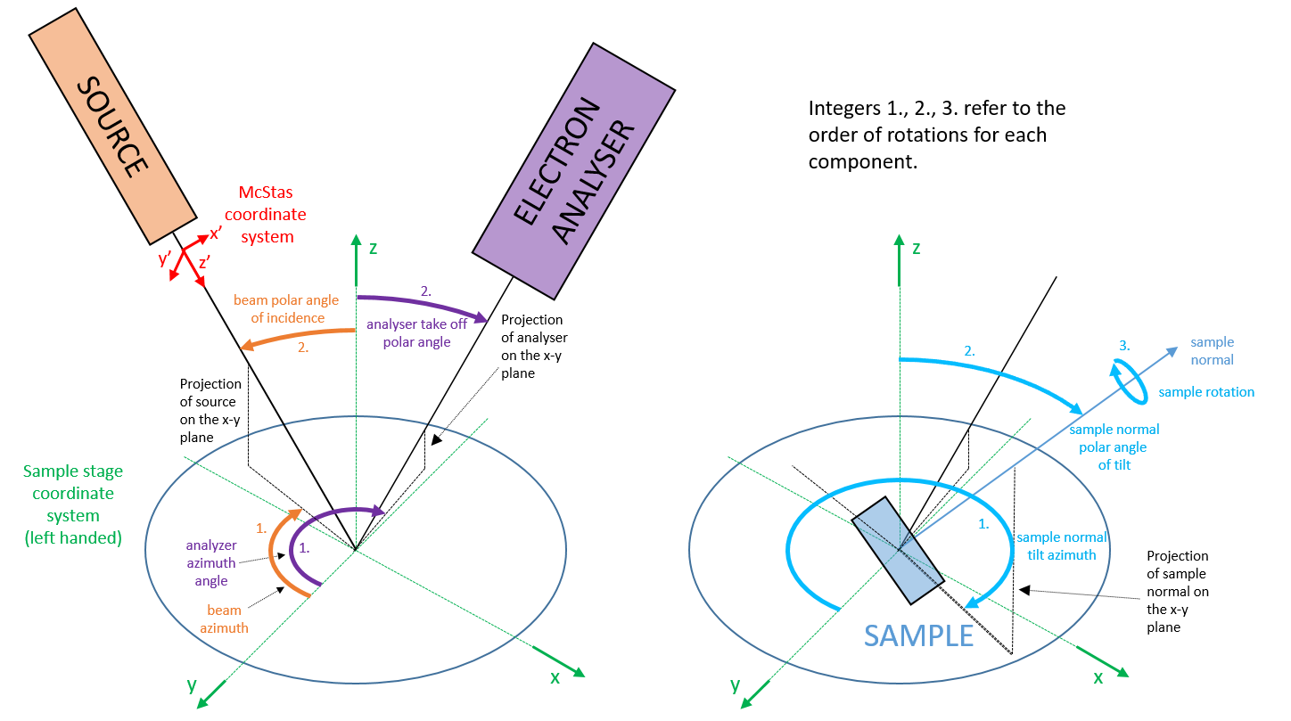 In traditional surface science, a left-handed coordinate system is used such that the positive z-axis points along the normal of the sample stage, and the x- and y-axes lie in the plane of the sample stage. However, in NeXus, a coordinate system that is the same as McStas is used. xps_coordinate_system gives the user the opportunity to work in the traditional base coordinate system.