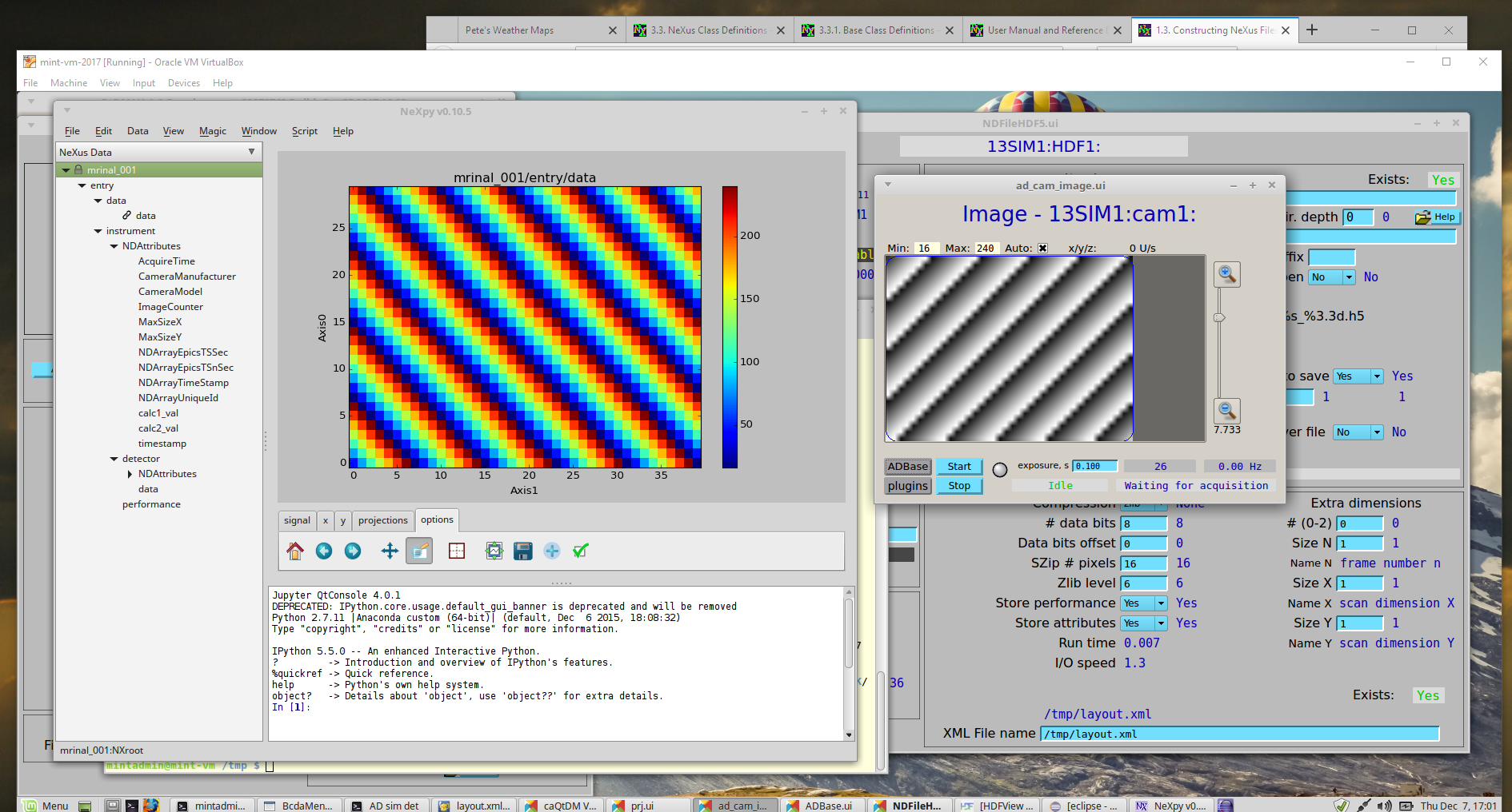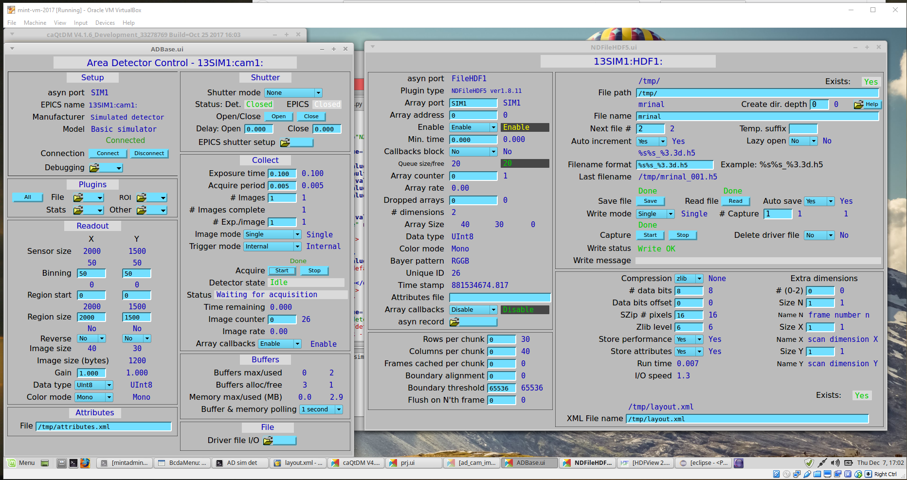 You can visualize the HDF5 files with several programs, such as: hdfview [9], nexpy [10], or pymca [11]. Views of the test image shown using NeXPy (from the HDF5 file) and caQtDM (the image from EPICS) are shown.