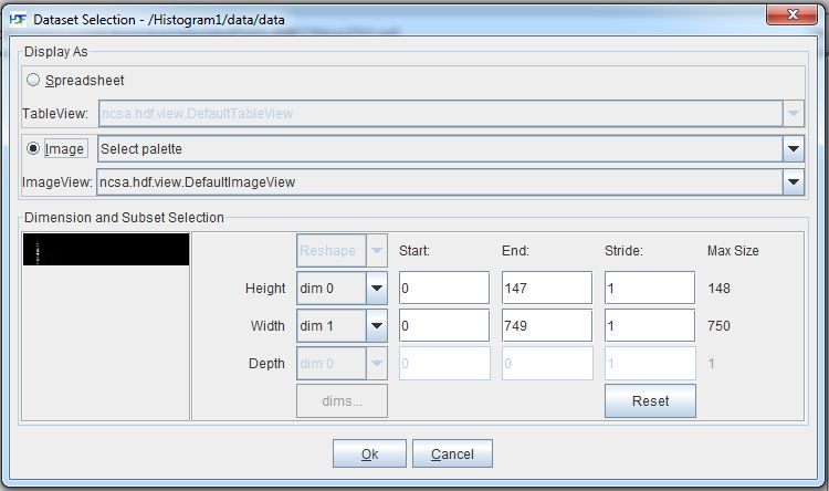 The data may be represented as an image by accessing the Open As menu from HDFview (on Windows, right click the dataset called data and select the Open As item, consult the HDFview documentation for different platform instructions). Be sure to select the Image radio button, and then (accepting everything else as a default) press the Ok button.